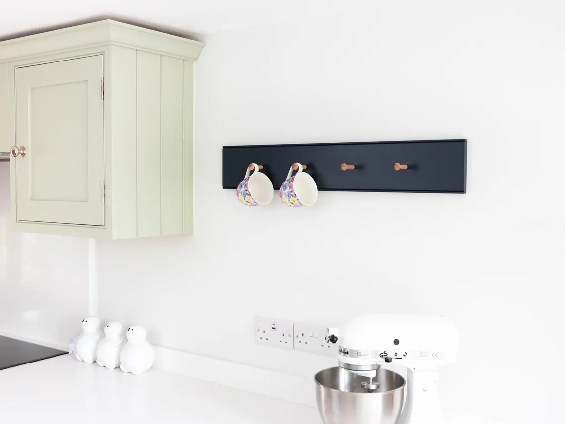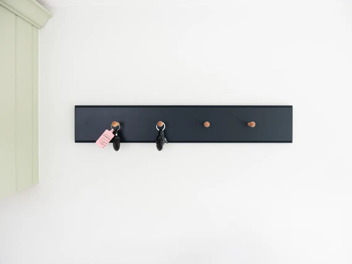 The images shown are of a peg rail painted in Farrow and Ball ‘Railings’.