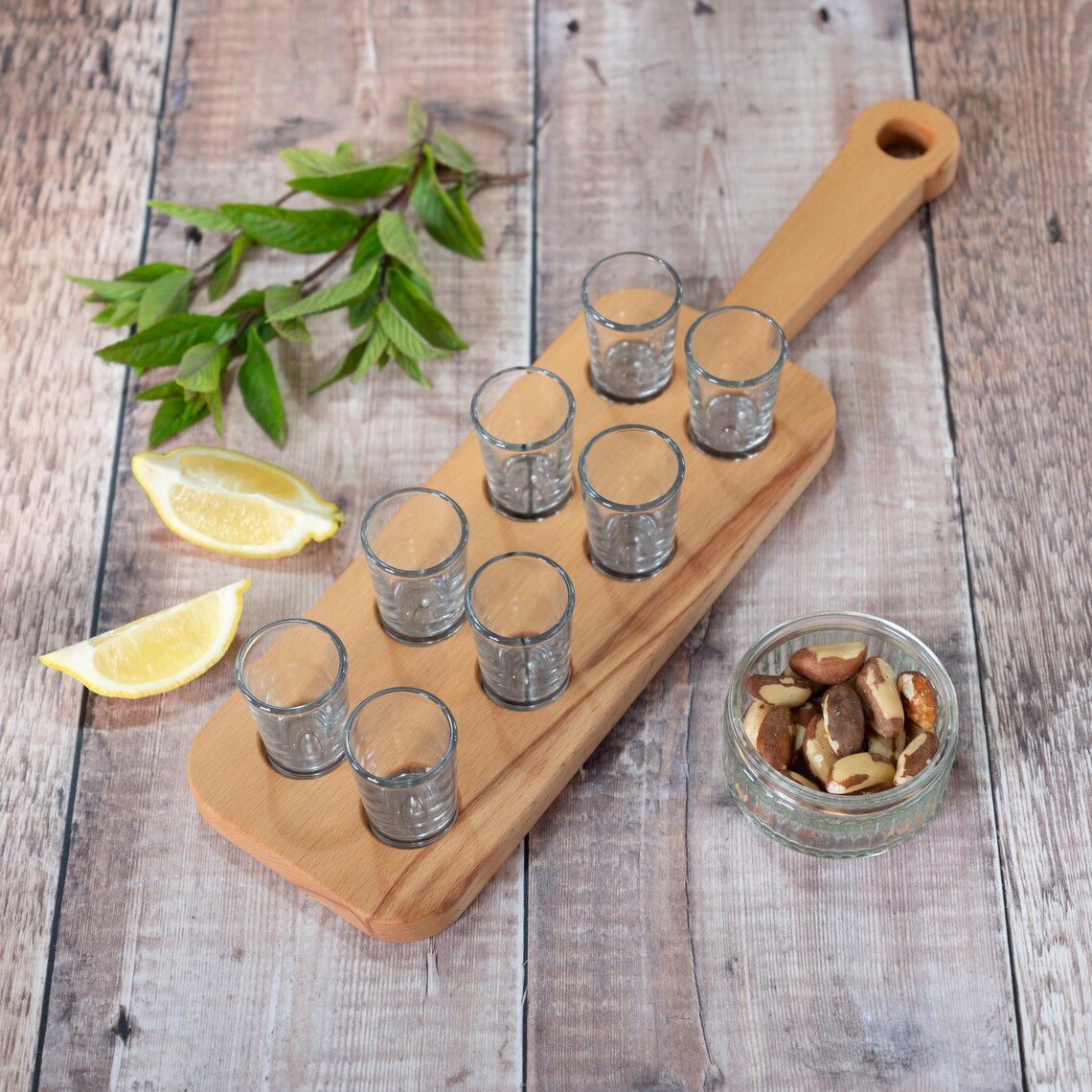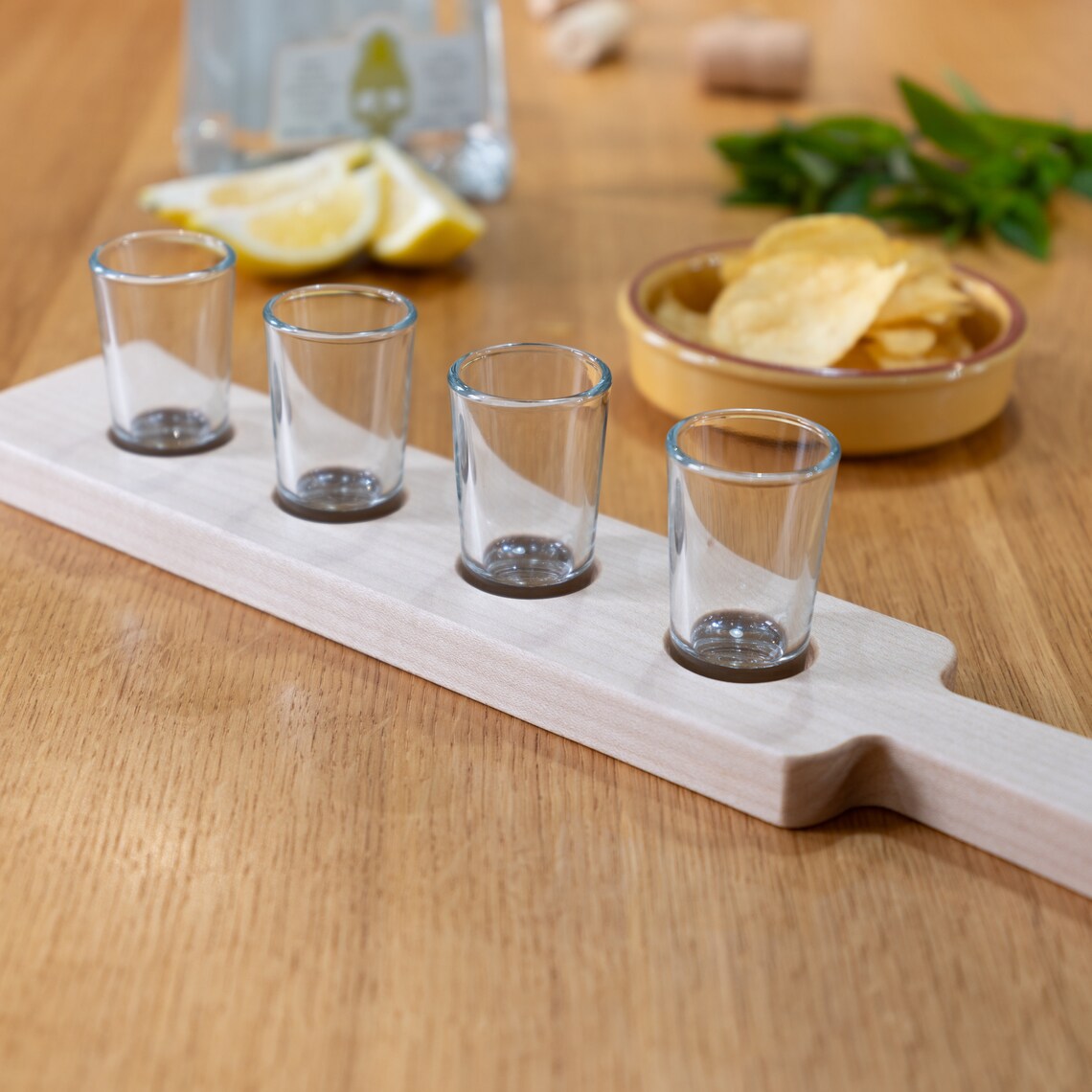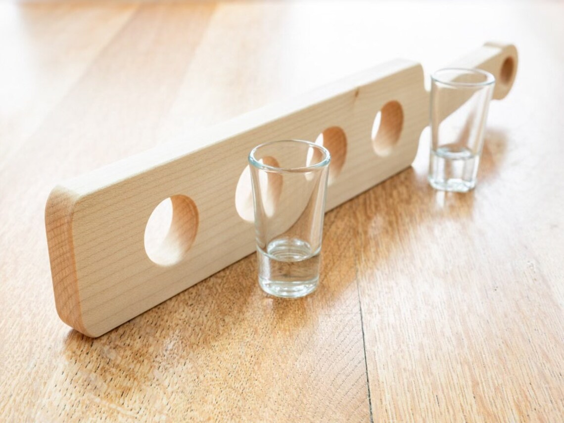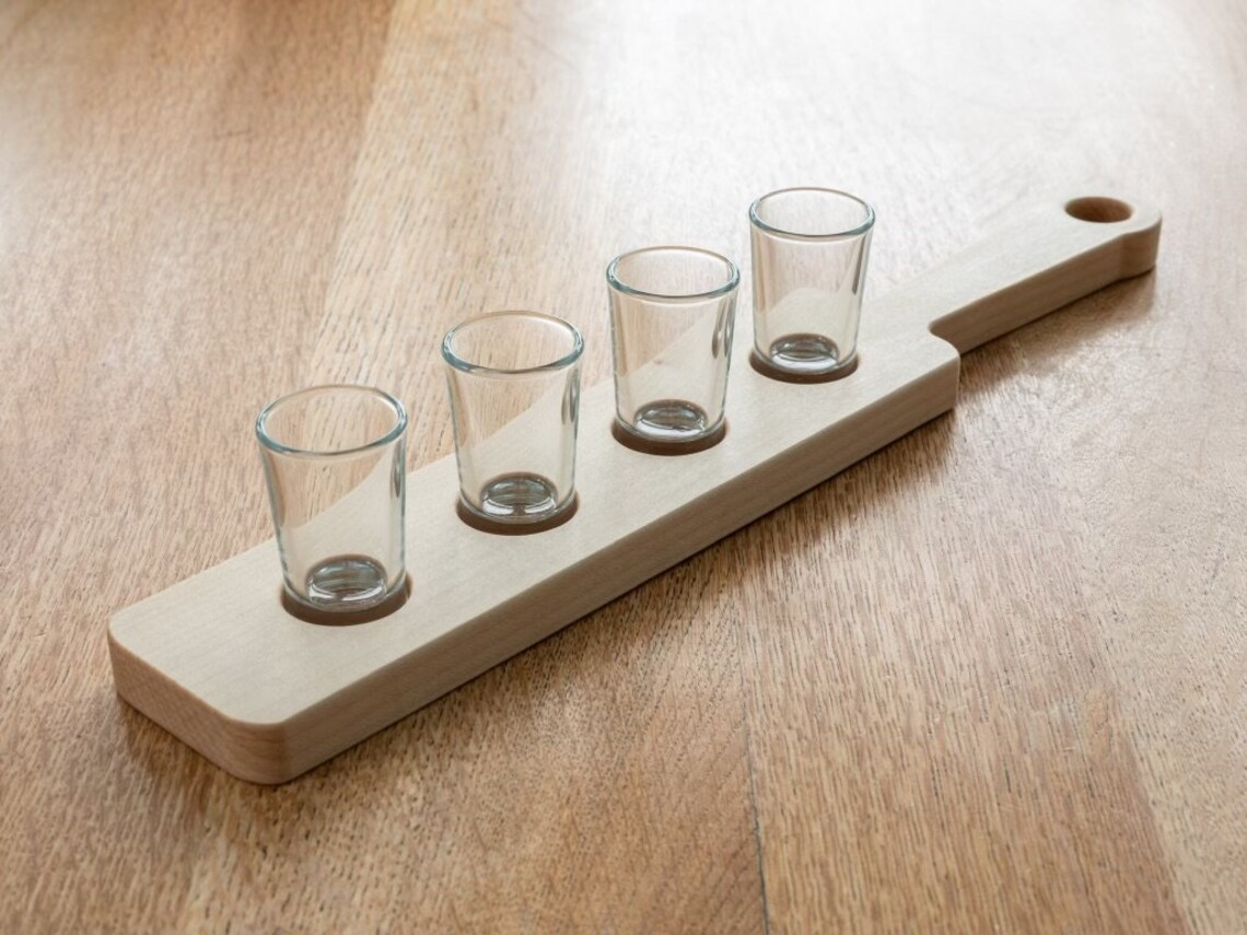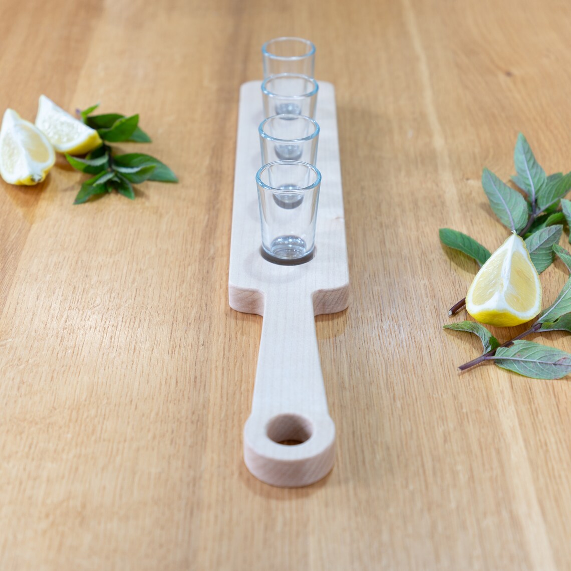 Our handcrafted wooden shot glass paddle board is made from solid maple and makes an ideal Home Bar Gift or Celebration Shot Glass Flight.