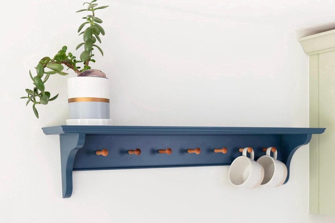 Our Shaker Peg Shelf makes a lovely Farmhouse Mug Rack, Coat Rail, Kitchen Peg Shelf, Utility Hat/Keys/Scarf Tidy or Nursery Shelf.