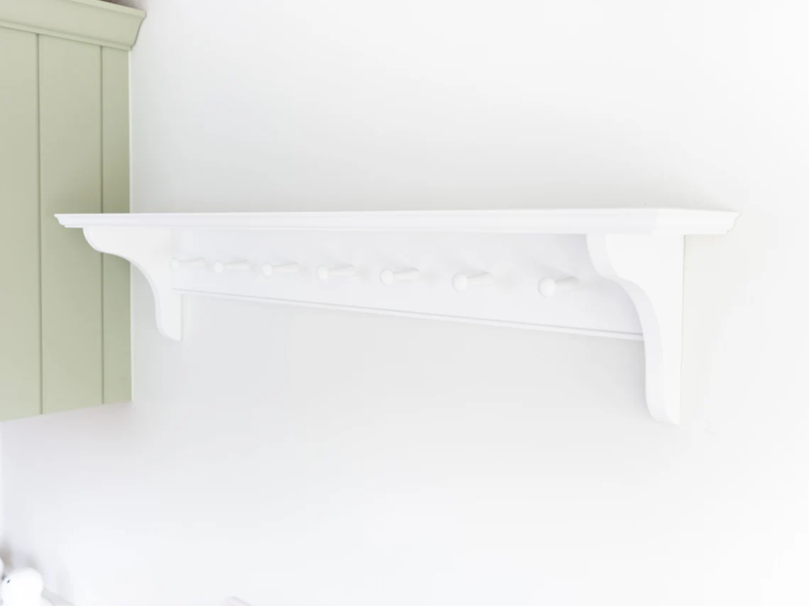 A beautifully handmade Shaker Peg Shelf which has been lovingly crafted from Tulip and primed with 2 coats of Primer, in preparation for you to complete at home.