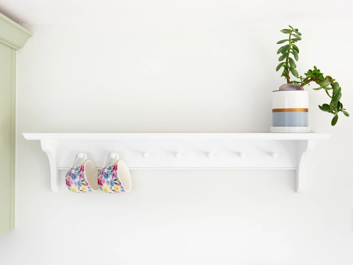 High quality, ready-primed shelf to use as a Coat Rack, Kitchen Peg Shelf, Utility Shelf, Farmhouse Mug Rack or Hat Hooks.