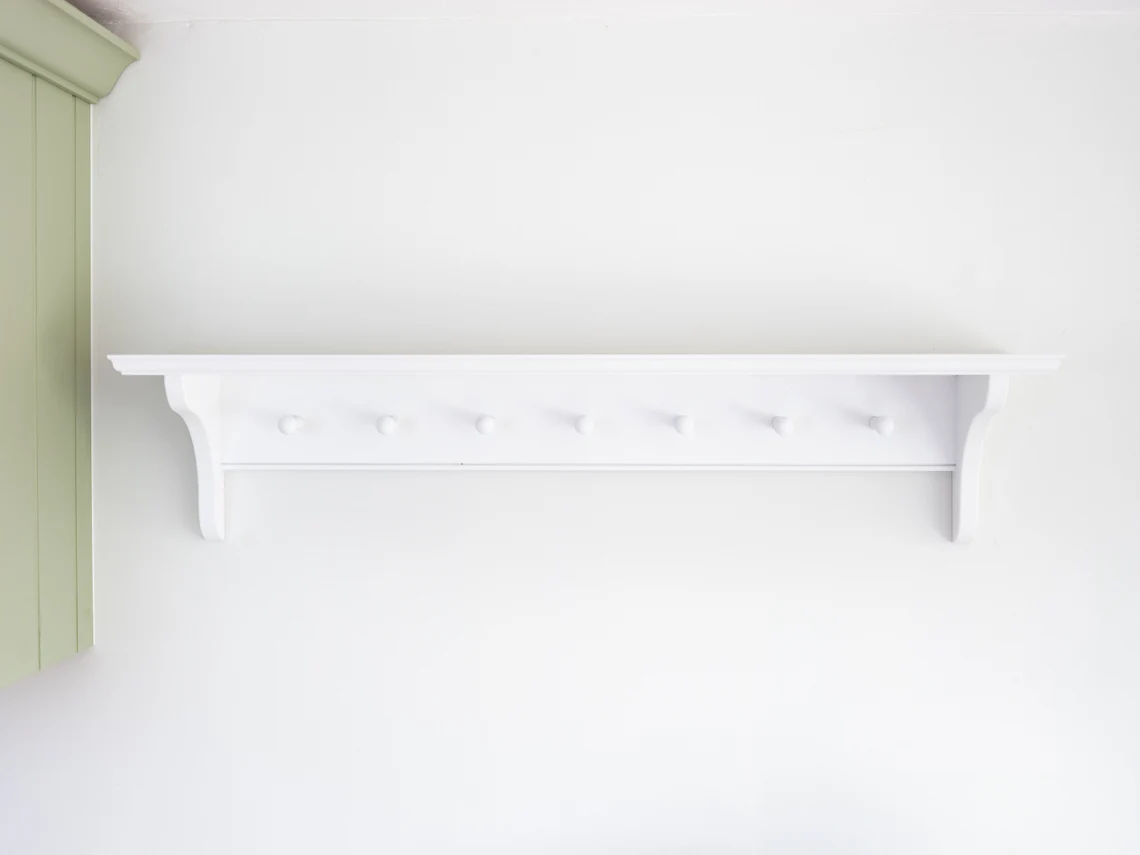 The Shaker Peg Shelf makes the most beautiful coat, hat, scarf and dog lead ‘tidy’, allowing for all your outdoor necessities to be stored in one place.